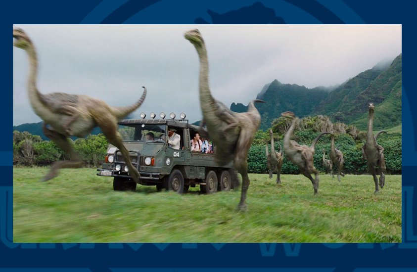 En este universo cinematográfico los Gallimimus poseen una piel escamosa, si bien todo indica en realidad que estarían cubiertos, al menos parcialmente, de plumas.